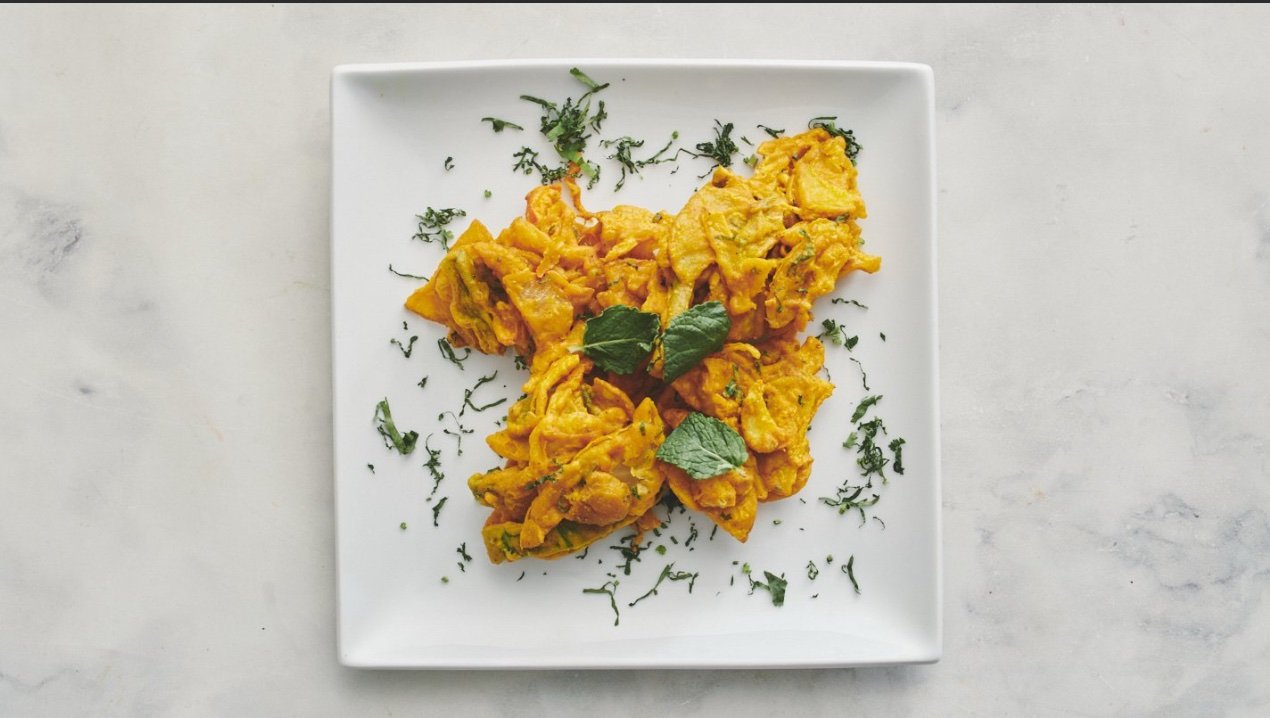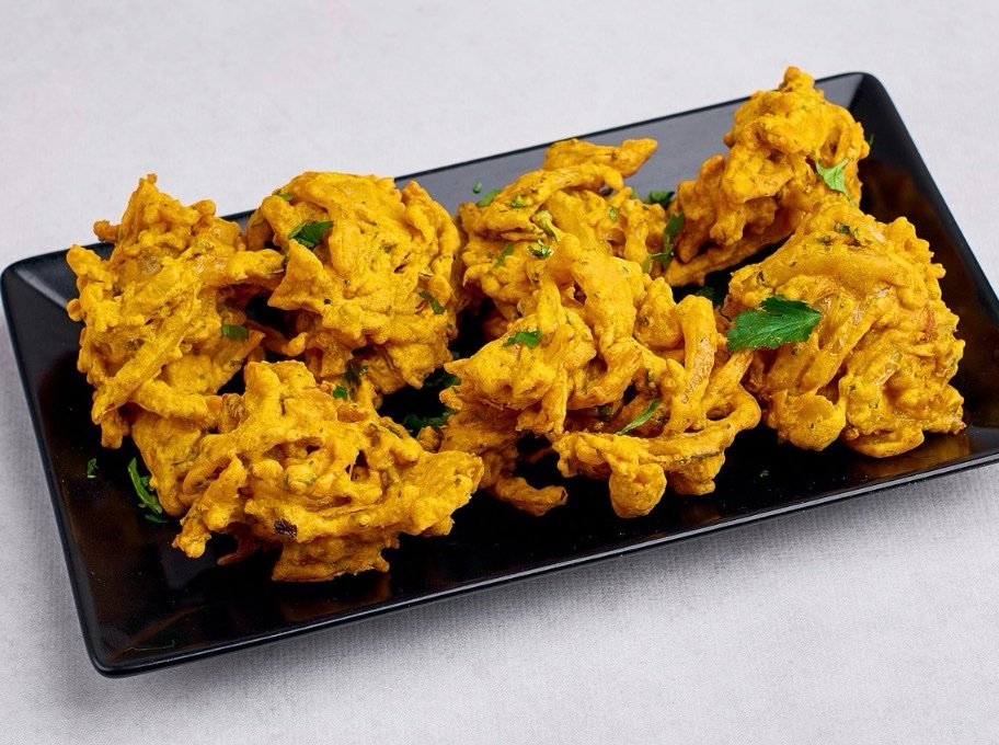 Løg og kartofler vendt i kikærtemel med krydderier og urter, friteret i vegetabilsk olie.