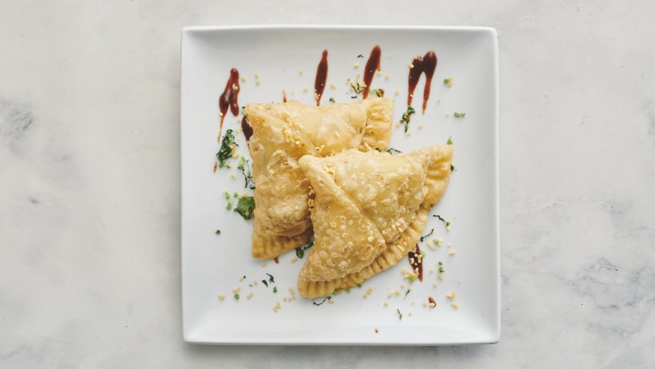 2 stk. samosa, sprød trekant formet med fyld af let krydrede kartofler og ærter. Serveres med tamarind- og myntesauce.