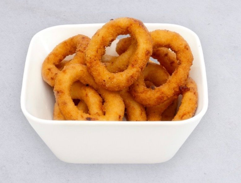 8 stk. løgringe i krydret dej af kikærtemel, friteret i vegetabilsk olie.