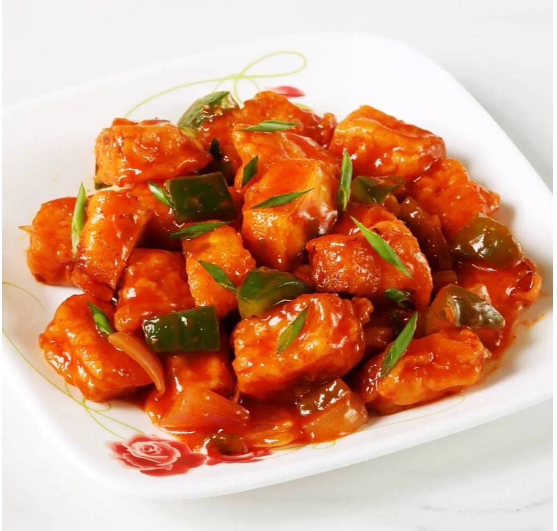 Hjemmelavet indisk hytteost vendt i chilisauce, tilberedt i krydderier, en velkendt kinesisk-inspireret ret der har sine rødder i det nordindiske køkken