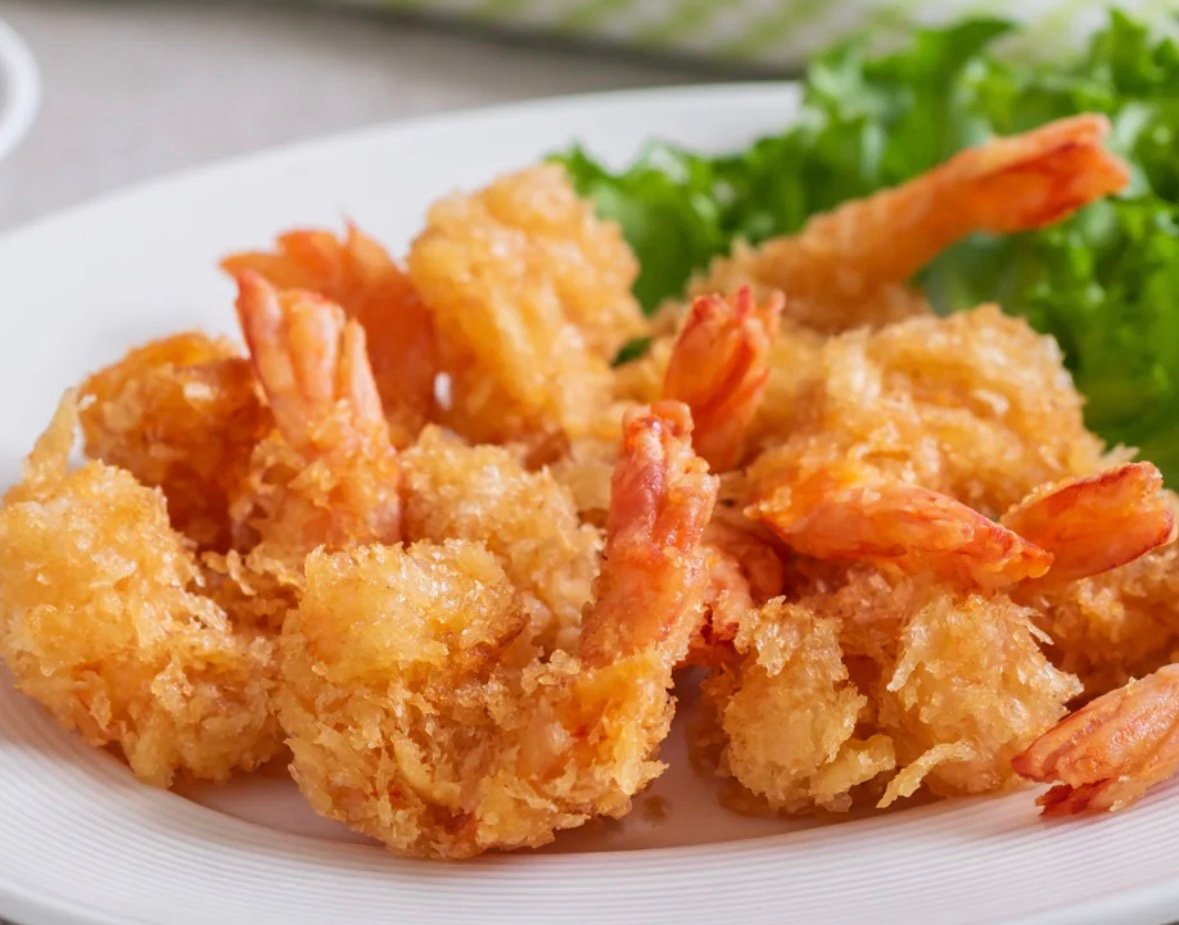 6 stk. kongerejer dyppet i krydret dej og friturestegt. Serveres med salat og citron.